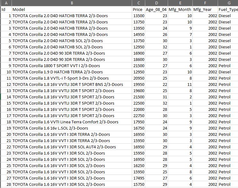 Data: I am using less columns than original dataset. Here is how the ‘toyota_data’ (from the code above) looks after modification.