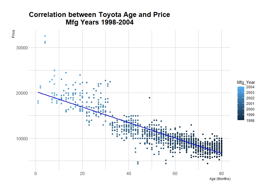 The colors represent different manufacturing years for Toyota vehicles. The light-to-dark blue color gradient likely corresponds from 1998 to 2004. I have added the year manufacturing to show more context to the data; however, the spread of all manufacturing years across the range of ages suggests that the manufacturing year may not have a substantial effect on the price when accounting for the age of the vehicle.