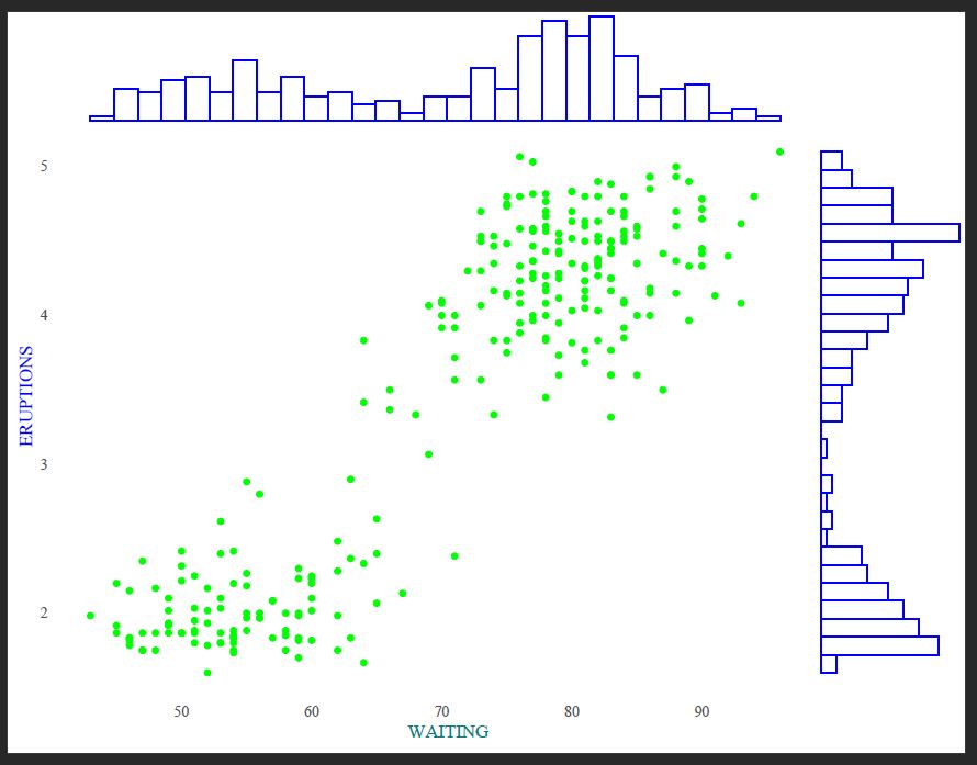 Marginal Histograms: Marginal histograms surround the scatterplot on its top and right sides. These histograms show the distribution of values for the “waiting” variable (top histogram) and the “eruptions” variable (right histogram). Each histogram consists of bars representing the frequency or count of observations falling into different bins of the respective variable.