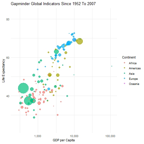 labs(x = "GDP per Capita", y = "Life Expectancy", title = "Gapminder Global Indicators Since 1952 To 2007") +