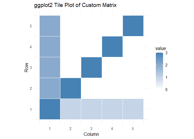 The combination of diag() for creating the base matrix and matrix indexing for targeted adjustments provided a clean and intuitive solution. This method showcases how basic R functions can achieve complex transformations with minimal code when applied thoughtfully.