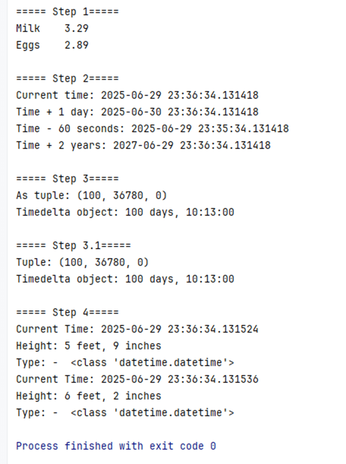 This assignment provided an opportunity to deepen my understanding of Python’s datetime, timedelta, and relativedelta classes, as well as creating practical functions and processing iterative data. The task required modernizing and extending several code snippets provided by the instructor, translating them into Python 3 syntax and enhancing them to perform multiple time-based operations.