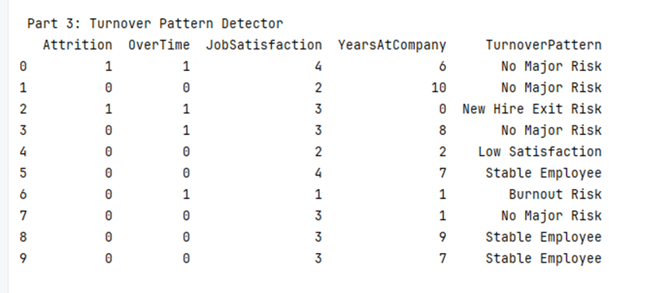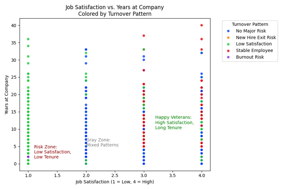 Another visualization mapped job satisfaction against years of service, with each employee color-coded by their turnover pattern. This revealed clear clusters, with low satisfaction and short tenure serving as red flags, and high satisfaction with long tenure indicating an ideal. In between, there was a “gray zone” of employees who didn’t clearly fall into one of the risk types. These visuals confirmed that even simple data logic can surface meaningful insights about workplace trends and employee behavior.