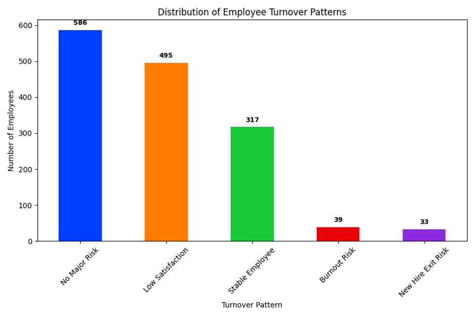 I began by cleaning the dataset and converting key columns such as “Attrition” and “OverTime” into numeric values. From there, I created logic-based categories to identify employee types: Burnout Risk, Low Satisfaction, New Hire Exit Risk, Stable Employee, and No Major Risk. These labels were based on clear, human-centered logic. For example, Burnout Risk included employees with low job satisfaction, high overtime, and fewer than three years of service at the company. After applying these labels, I visualized the results using Python’s matplotlib and seaborn libraries.